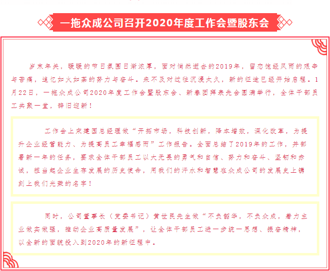 一拖眾成公司召開2020年度工作會(huì)暨股東會(huì)、新春團(tuán)拜表先會(huì)